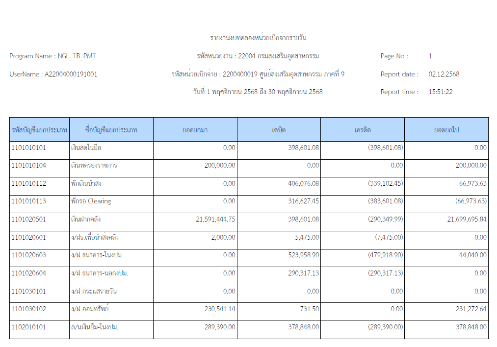 รายงานงบทดลอง - รหัสหน่วยเบิกจ่าย 2200400019 ศูนย์ส่งเสริมอุตสาหกรรมภาคที่ 9 วันที่ 1-30 พฤศจิกายน 2568 เอกสารแนบ