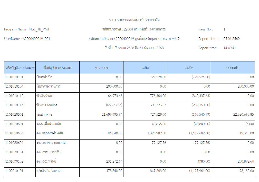 รายงานงบทดลอง - รหัสหน่วยเบิกจ่าย 2200400019 ศูนย์ส่งเสริมอุตสาหกรรมภาคที่ 9 วันที่ 1-31 ธันวาคม 2568 เอกสารแนบ